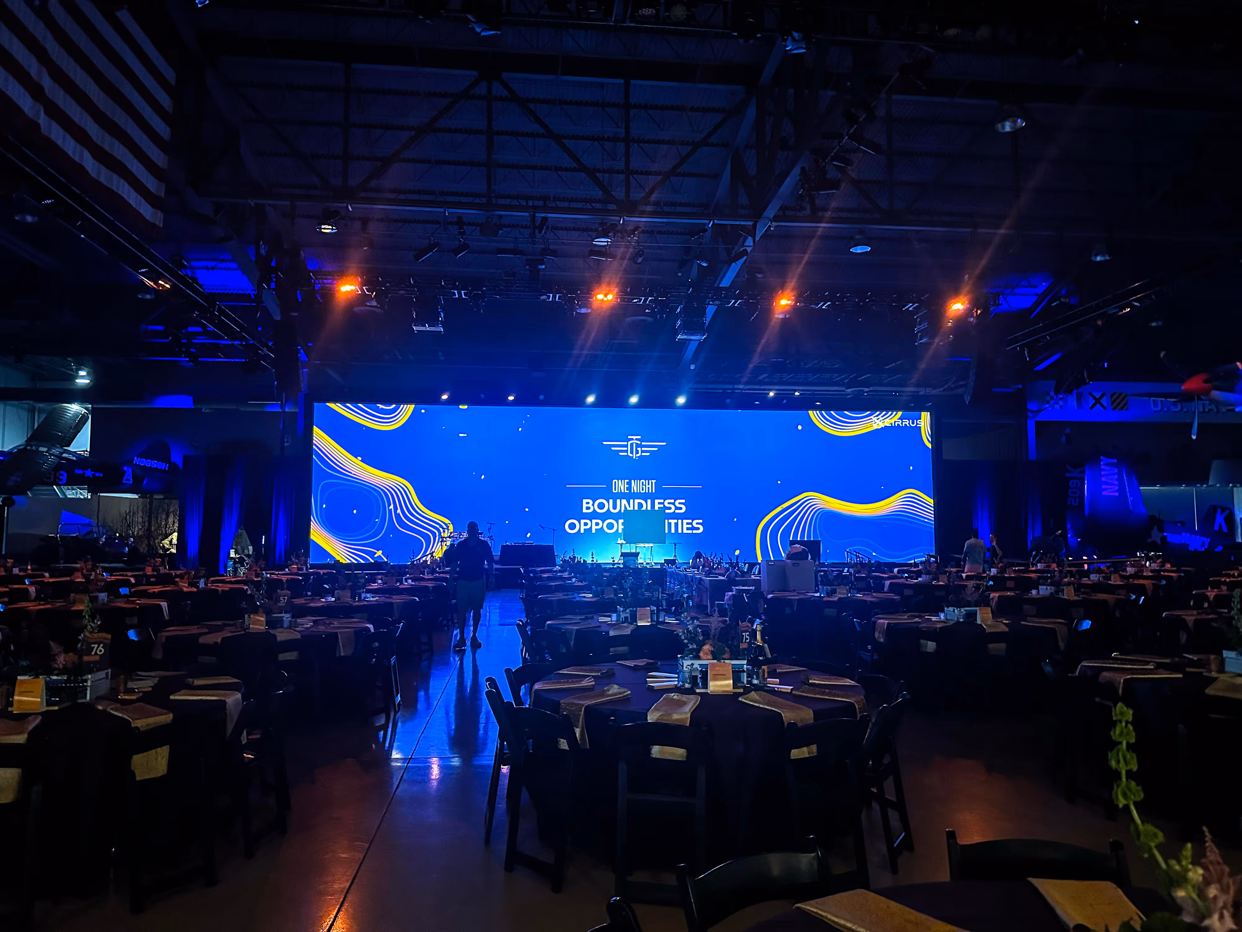 In hangar shows, we turn raw aviation space into a finished environment: flown lighting, LED, scenic, and show calling that work around doors, aircraft, and safety zones without losing impact.